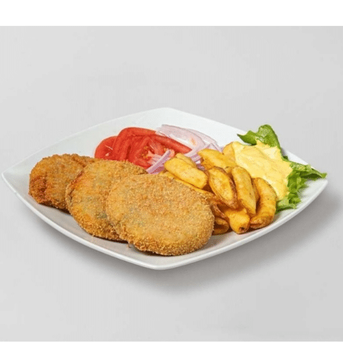 Mit tzatziki salatblätter tomaten parmesan und pommes