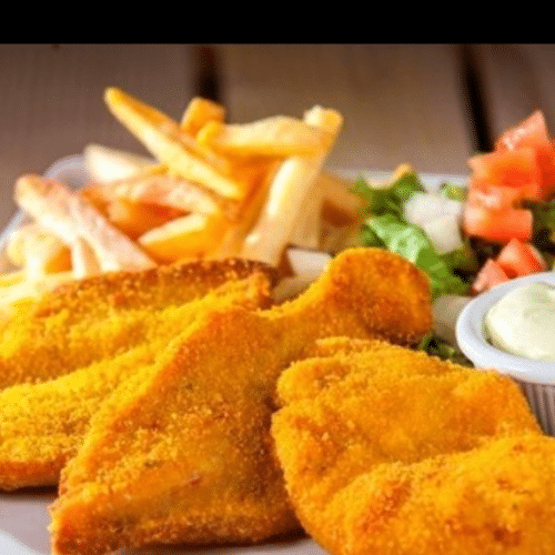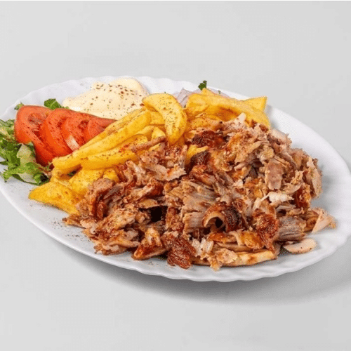 Alle Gerichte werden mit grünem Salat, Tomaten, Zwiebeln, Tzatziki und Pommes frites serviert.