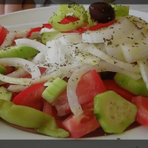 grüner Salat mit Tomaten, Gurken, Zwiebeln, Schafskäse, Oliven und Essig-Öl-Dressing